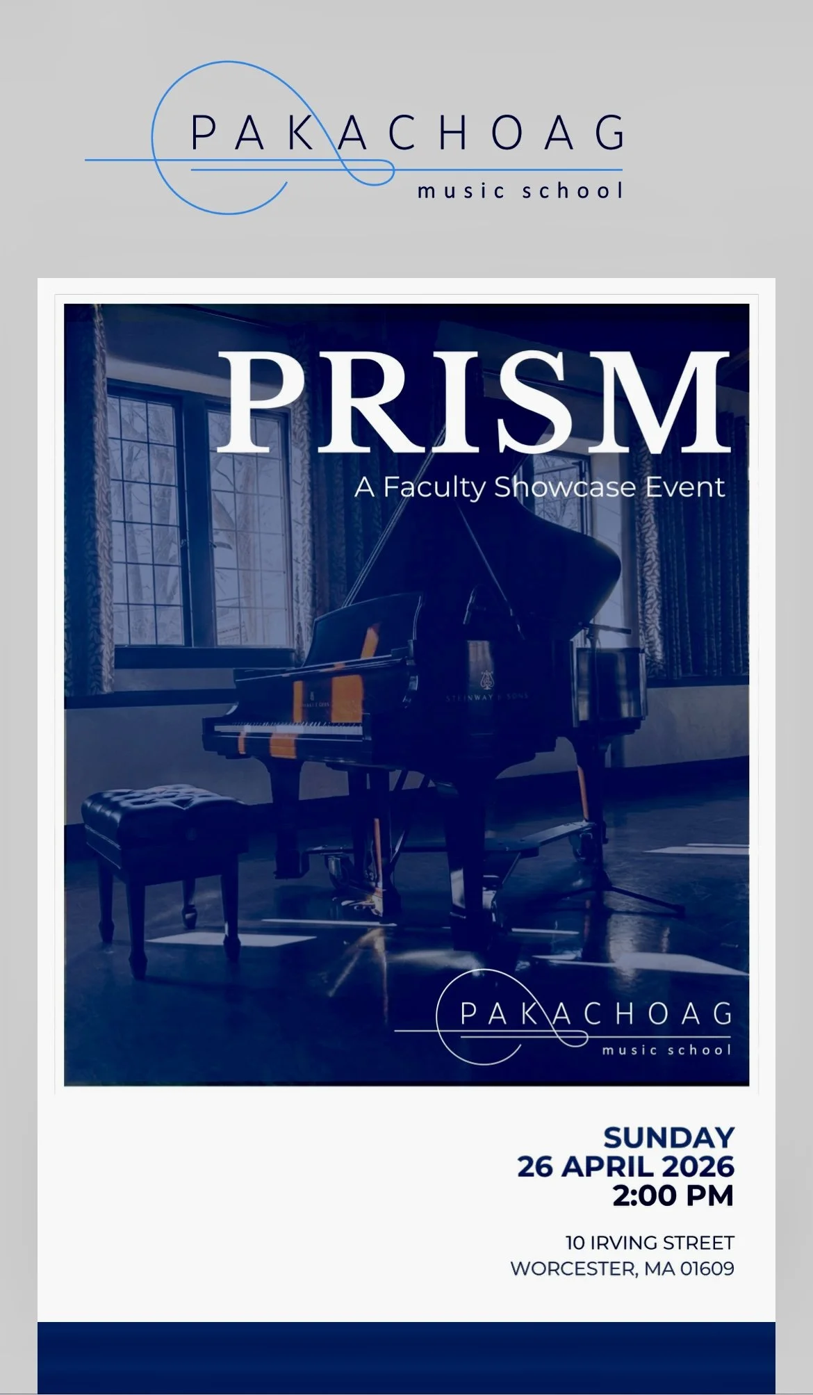 PRISM is an afternoon of live performances by the people who make Pakachoag what it is. Jazz combo. Piano trio with singers. Fiddle duo. Chamber music. The full range of what our faculty does when they step out of the lesson room and onto the stage.